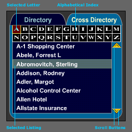 The directory contains the alphabetical listings by name. The cross directory contains the listings by the numerical location on the streets. The streets are ordered alphabetically and you will look for locations by street and number within the cross directory. You can jump from the directory to the cross directory by pressing the buttons labeled accordingly. Both directories are provided with an alphabetical index which lets you jump from one letter to another. The active letter in the index will be highlighted to show you where in the directory/cross directory you are. You can scroll up or down within a listing by using the scroll buttons on the right side of the directories.